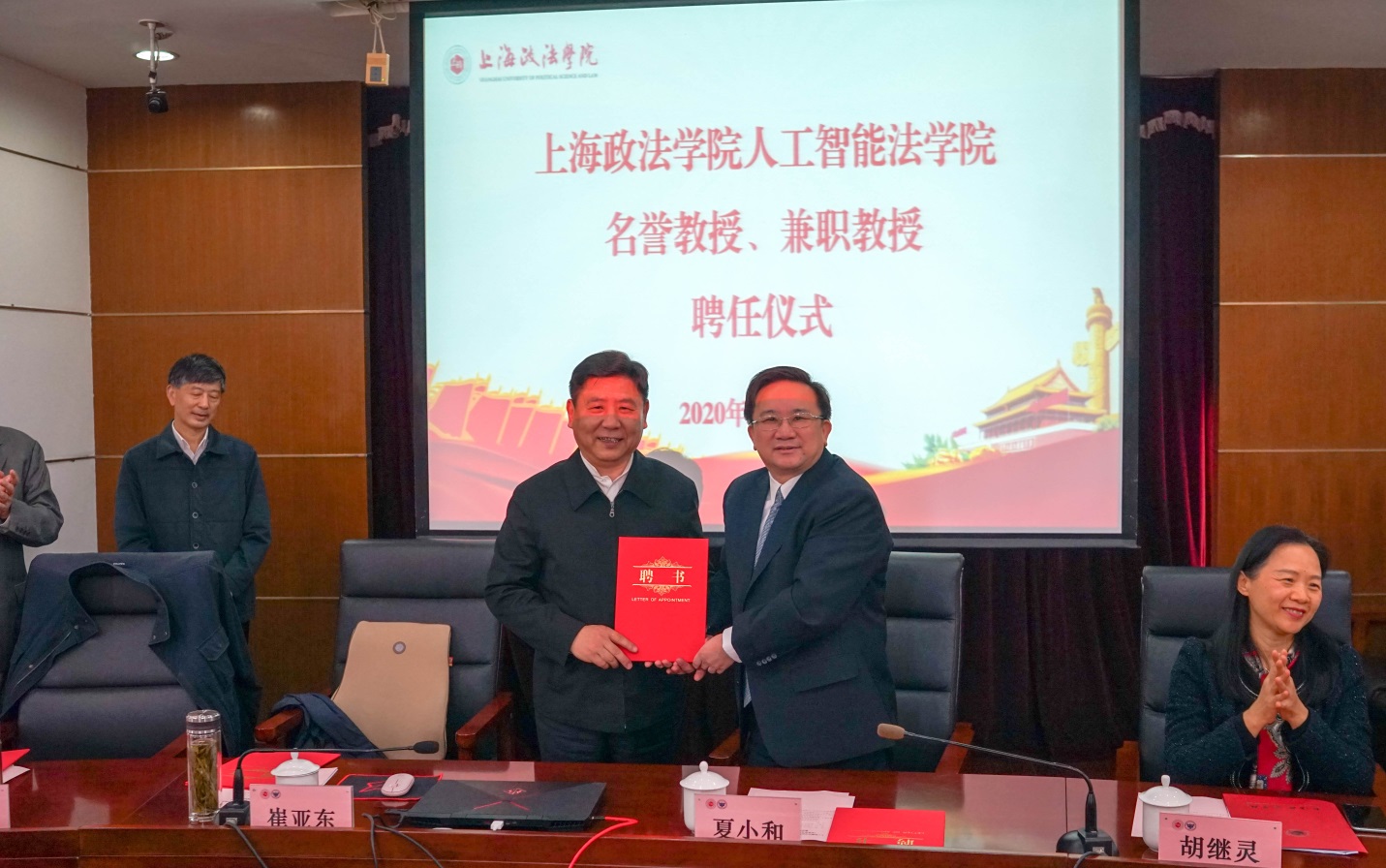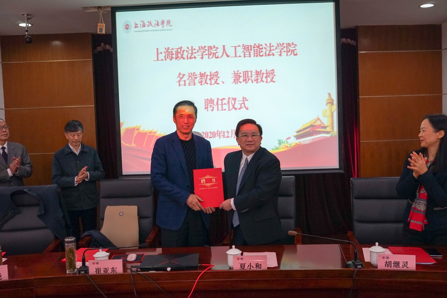 仪式上,胡继灵宣布聘任上海市法学会会长崔亚东为人工智能法学院名誉教授,聘任蚌埠市委原副书记、政法委第一书记刘学尧、安徽省委宣传部原副部长董庆、浙江清华长三角研究院法治与社会治理研究中心主任白宁为兼职教授。夏小和代表学校向名誉教授、兼职教授颁发聘书。人工智能法学院院长杨华主持聘任仪式。