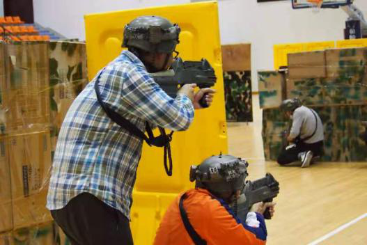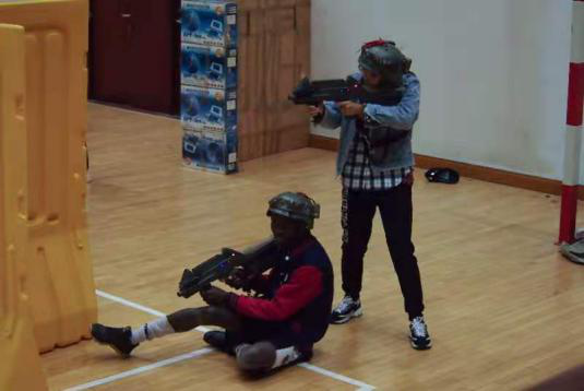 在搏越馆,万众期待的真人CS比赛于晚上六点如期举行。同学们了解比赛规则后,对讲机一声令下,各队队员从不同的方向出发,穿梭于掩体之间。每个人都以非常专注的态度对待这场对抗,虽然国际交流学院的同学们是第一次尝试,但是在面对对手时毫不气馁,勇往直前、举枪瞄准、奋力对抗,战况十分激烈。比赛结束时刻,两队握手言和,展现出对彼此的尊重和良好的友谊。