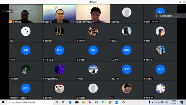 12月22日晚,中国机电产品进出口商会投资促进部主任、中俄机电商会秘书长盛国飞,全国律协外事委员会外事委员、北京市信达立律师事务所主任周广俊莅临上海合作组织法律服务讲坛,就“后疫情时代中俄经贸合作现状、机遇以及企业对俄语人才的需求”主题进行线上讲座,并与我校30余名丝绸之路律师学院师生进行了交流。中国-上合基地办合作部主任、上合组织法律服务委员会中方筹备办执行秘书长姜思源主持讲座。