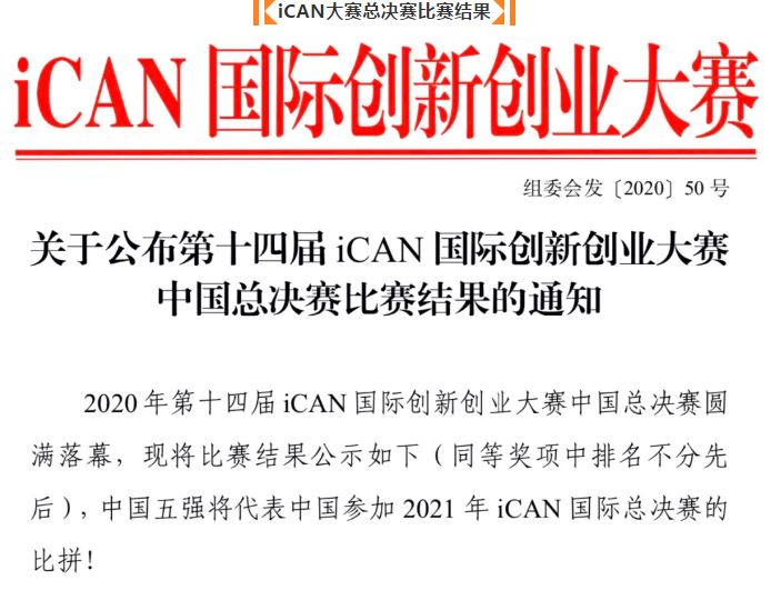 2020年12月末,由教育部创新创业教育指导委员会、教育部创新方法教学指导分委员会、北京大学主办的第十四届iCAN国际创新创业大赛中国区总决赛落下帷幕,我校赛队获得大赛全国三等奖荣誉。
