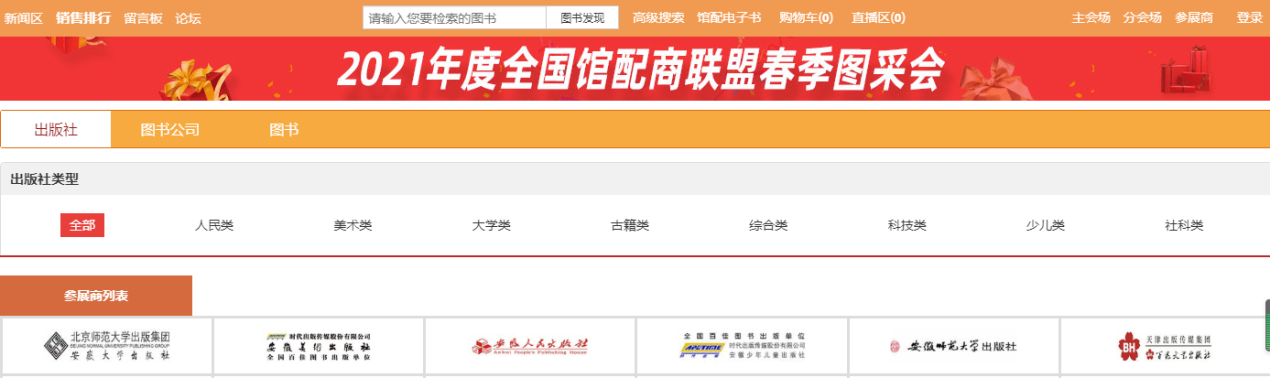 2.1 出版社分会场:按出版社综合分类和出版公司名称展示各出版社图书,点击分类首先展示该类别下的出版社名单,点击出版社名称即可进入选书界面。
