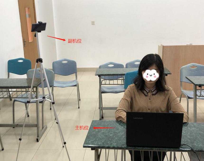 (3)【主机位】设备需要正向面对考生,复试全程开启,摄像头正对考生。复试过程中,要求视频中考生界面底端始终不得高于腹部,双手须摆放于桌面上,全程在视频录像范围。【副机位】手机作为远程面试云监考,摄像头需摆放在考生侧后方(与考生后背面成45°角),能够全程拍摄考生本人和电脑屏幕以及桌面周边场景,复试全程开启。主副机位位置、主机位镜头画面和副机位镜头画面应参照下列图示: