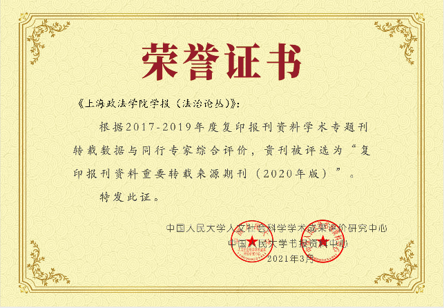 近日,在中国人民大学人文社会科学学术成果评价研究中心和中国人民大学书报资料中心发布的2020年度中国人民大学人文社科评价成果系列榜单中,《上海政法学院学报(法治论丛)》入选《复印报刊资料重要转载来源期刊(2020年版)》。该榜单依据2017-2019年度复印报刊资料学术刊的转载数据和同行定性评审结果,按21个学科划分,最终遴选出741种作为2020年版复印报刊资料重要转载来源期刊,其中期刊724种,集刊17种,法学类入选期刊50种。