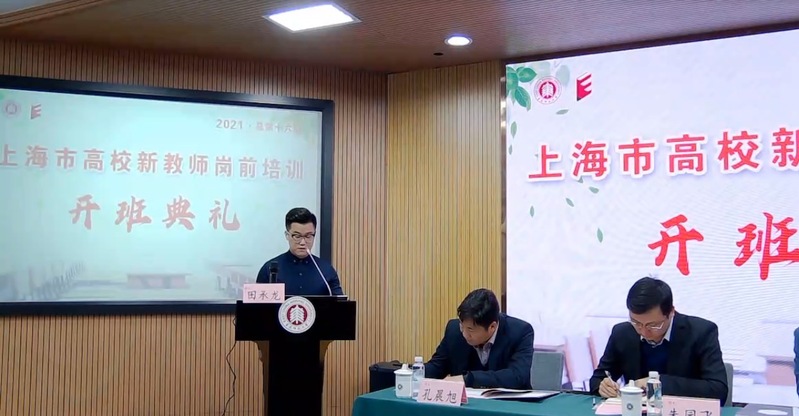 4月8日上午,2021年上海市属高校新教师岗前培训开班典礼(第16期)在华东师范大学举行,上海市教委人事处、上海市师资培训中心、华东师范大学高师师资培训中心等单位的领导出席会议。我校组织30余名新教师在求实楼513会议室参加线上直播培训,3名教师参加现场培训,其中我校新教师田承龙作为学员代表发言。