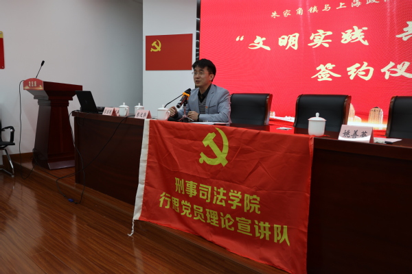 4月20日下午,刑事司法学院党总支书记姚善英、院长彭文华一行赴朱家角镇开展法治共建、精神文明共建系列活动。朱家角镇党委副书记管文军、党委委员吴文娟、朱家角镇政府各村区条线干部及刑事司法学院全院教职工共同参与了此次活动。共建活动由刑事司法学院党总支副书记张丽艳主持。