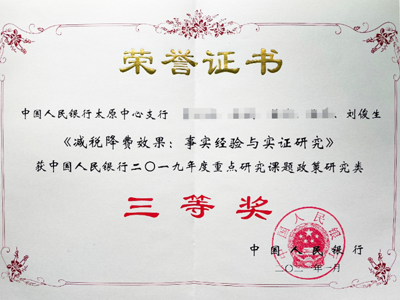 近期,中国人民银行办公厅公布了2019年度重点研究课题政策研究类获奖名单,经济管理学院教师刘俊生参与的《减税降费效果:事实经验与实证研究》,获中国人民银行2019年度重点研究课题政策研究类三等奖。