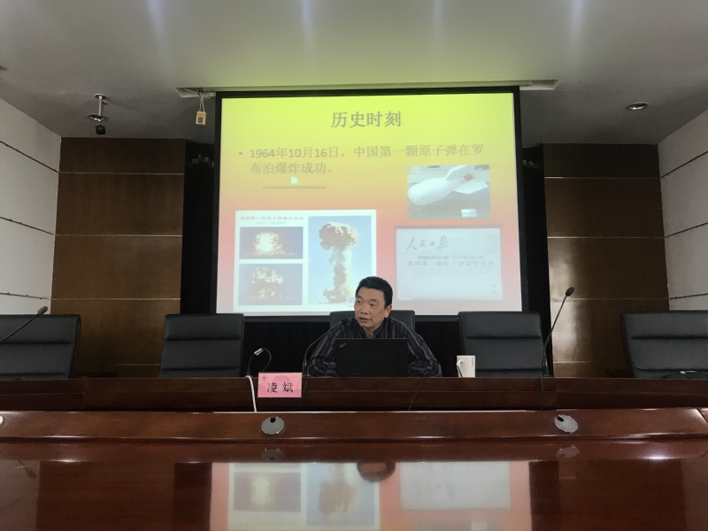 凌斌结合丰厚的专业知识及生动的影像材料分别讲述了我国第一颗原子弹、第一颗氢弹、第一颗人造卫星艰难的研制过程和“两弹一星”研制成功的深远意义,深刻阐释了“两弹一星”精神。他表示,在新中国最艰苦的时期,我国科技工作者从“一穷二白”起步,创造了“两弹一星”伟业,从20世纪50年代末到70年代初的10余年间,一批又一批科技工作者持续接力,用智慧、青春、热血乃至生命,在祖国的大地上锻造科技创新的丰碑,铸就了“热爱祖国、无私奉献,自力更生、艰苦奋斗,大力协同、勇于攀登”的“两弹一星”精神。