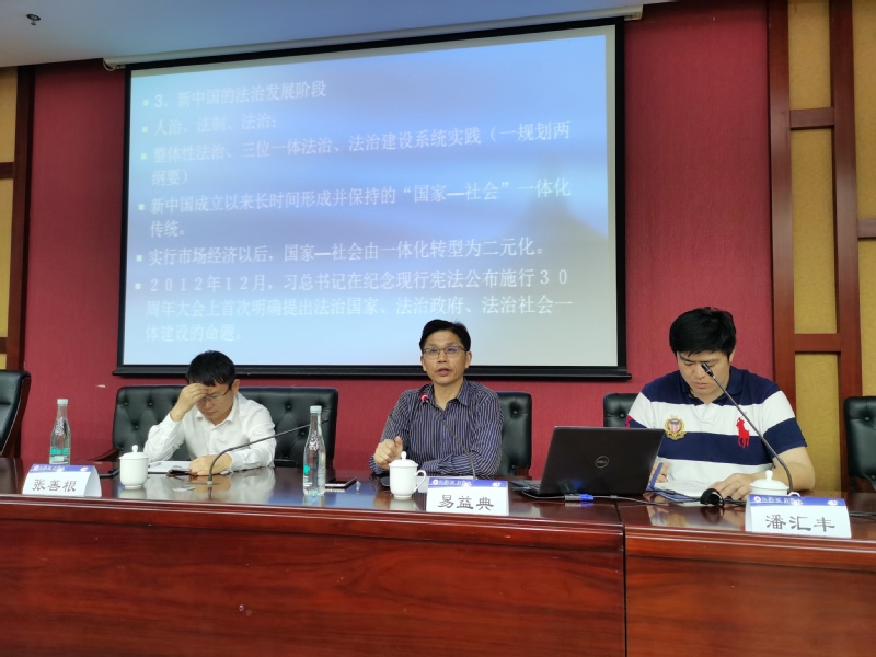 6月3日晚,我校前沿讲坛第三十一讲在综合研究中心107会议室举行。华东政法大学社会发展学院院长易益典教授莅临我校,为师生作“法治社会建设的规范结构和行动逻辑”学术讲座。我校张善根副教授参加与谈,科研处副处长(挂职)潘汇丰作为讲座主持人,百余名师生参加本次讲座。