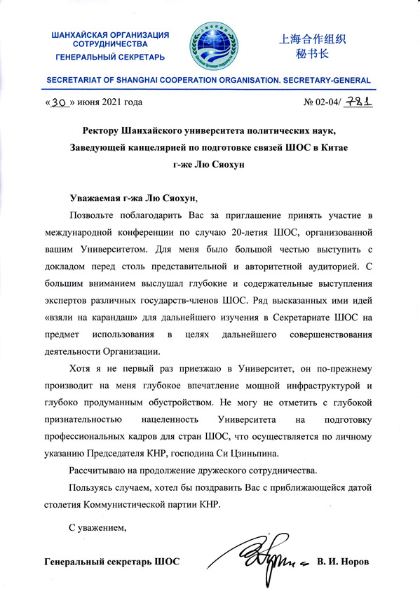 近日,上海合作组织秘书处秘书长诺罗夫代表上合组织秘书处向刘晓红校长发来感谢信。诺罗夫在信中对邀请其参加“上海合作组织20年:回眸与前瞻”国际研讨会表示感谢,对专家学者会议期间富有成果的讨论和工作积极赞扬,并指出成果将为上海合作组织的进一步发展提供智慧,有助于指导秘书处下一阶段的工作。