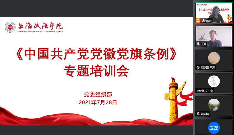 为认真贯彻执行《中国共产党党徽党旗条例》(中发〔2021〕29号,以下简称《条例》),充分发挥党徽党旗的政治功能,增强党的凝聚力、战斗力,7月28日下午,学校党委组织部通过线上形式举办《条例》专题培训会。学校党委常委、党委组织部统战部部长王静,机关党委专职副书记、党委组织部统战部副部长张东霞,各二级党组织专兼职组织员、机关各党支部组织委员等近50人参加会议。培训会由王静主持。