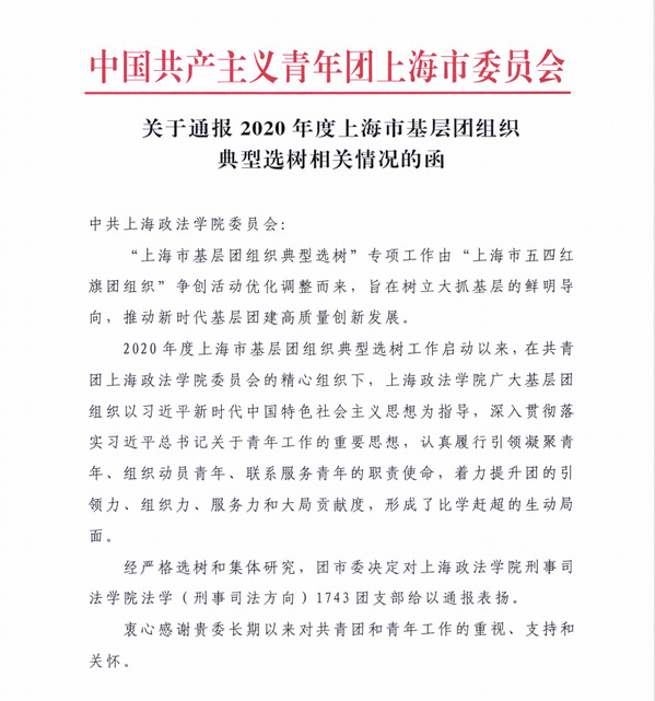 近日,我校刑事司法学院法学(刑事司法方向)1743团支部在2020年度“上海市基层团组织典型选树”专项工作中表现突出,荣获共青团上海市委员会通报表扬!