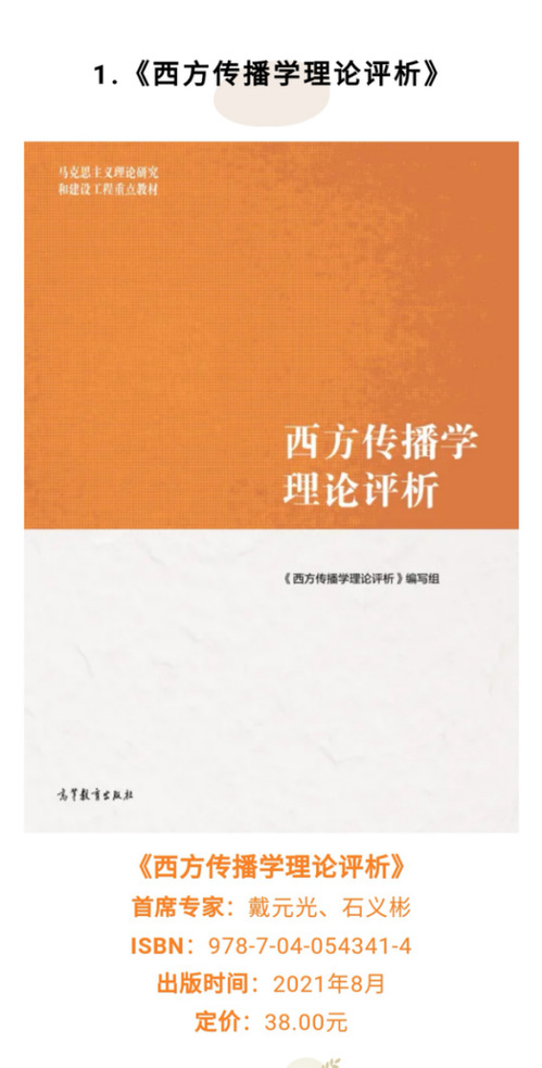 近日,我校上海纪录片学院戴元光教授担任第一首席专家的马克思主义理论研究和建设工程重点教材《西方传播学理论评析》已由高等教育出版社出版。