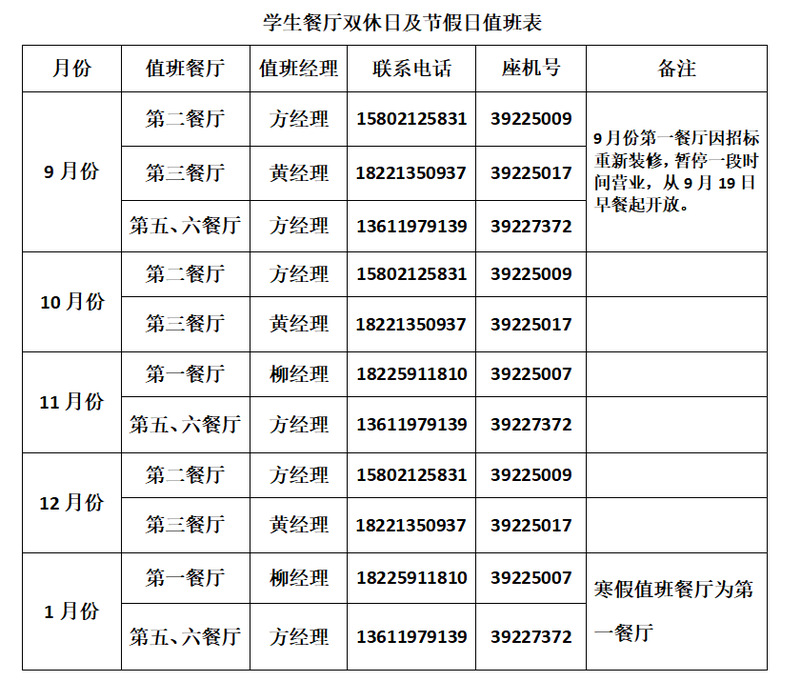 备注:如有不确定因素需要调整值班食堂的,以接到综合服务科书面通知为准。