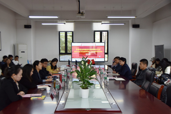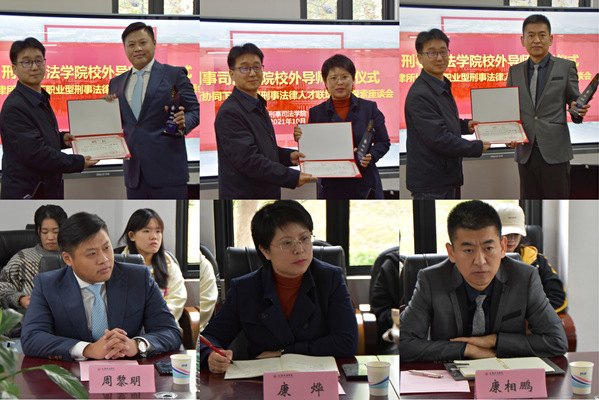 在导师聘任环节,姚善英向三位已与学校签约的律师致欢迎辞,彭文华向三位律师颁发了校外导师聘书。校外导师将为学生的理论与实务互动教学、课外实践等环节助力,推动学院应用型人才的培养。