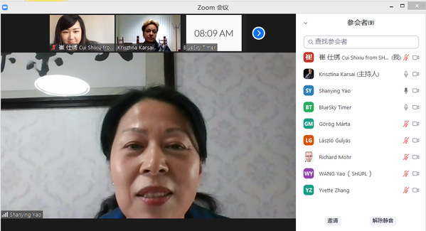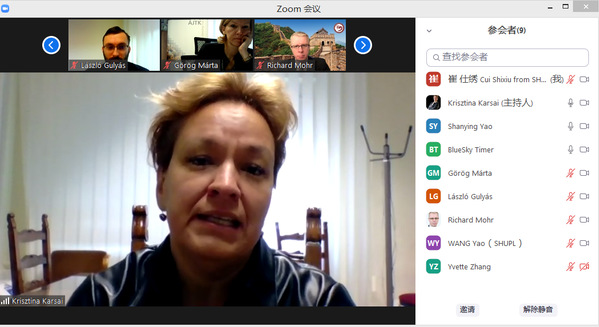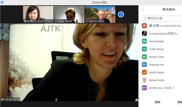 姚善英在致辞中向赛格德大学外籍专家表示欢迎,并就推进两校更为深入的国际交流合作寄予期待。KARSAI Krisztina教授在主旨发言中分享了赛格德大学在新冠疫情期间开展线上教学和国际交流合作的经验,并介绍了“门计划——欧洲和国际政治与法律研究(EIPLS)”短期研修项目的主要内容、课程设计和拟实施计划。