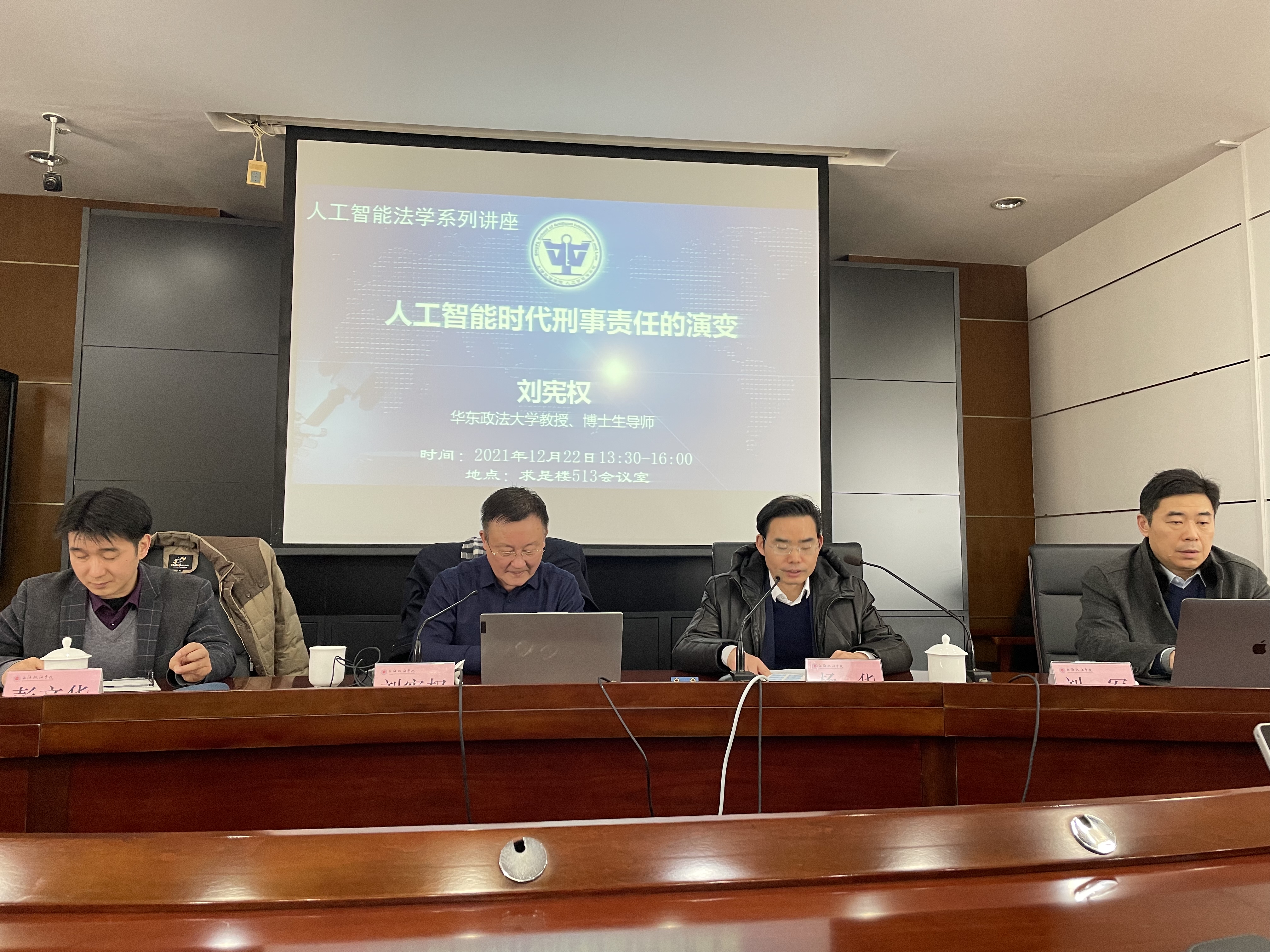 12月22日下午,应我校人工智能法学院邀请,华东政法大学刘宪权教授在求实楼513为师生作“人工智能时代刑事责任的演变”学术讲座。人工智能法学院院长杨华主持讲座,刑事司法学院彭文华教授、刘军教授参加与谈。