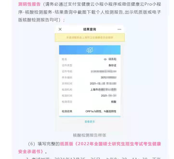 (5)考前48小时内(12月23日、24日)在本市的新冠病毒核酸检测阴性报告(请务必通过支付宝健康云小程序或微信健康云Pro小程序-核酸检测服务-结果查询中截图下载个人检测报告,出示纸质版或电子版核酸检测报告均可);