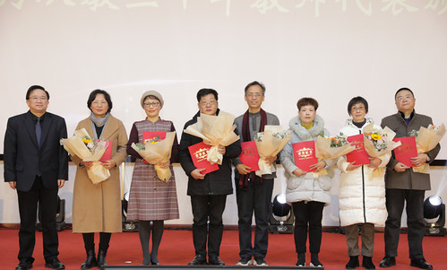 建校37年来,一代又一代上政人埋头干事业、潜心育人才。主持人杨铠宣读了从教30年教师名单,他们是:刘晓红、郑少华、刘会强、王丽华、占茂华、黄吉品、江维龙、周志宏、许青、尹春晨、丁海鸣、张伟文、陆满娟、韩惠芝、蔡弘、张敏。校党委书记夏小和为从教三十年教师代表颁奖,学生代表献花。