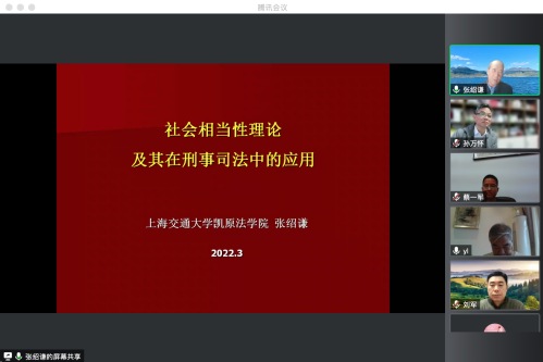 上海交通大学凯原法学院张绍谦教授受邀为我校师生作“社会相当性原理及其在司法中的运用”学术讲座。讲座由我校闫立教授主持,华东政法大学刑事法学院院长孙万怀教授、我校警务学院院长蔡一军教授、刑事司法学院刘军教授、科研处处长赵运锋教授共同参加与谈。来自司法实务部门的人员与我校师生合计600余人共同在线参与本次讲坛。