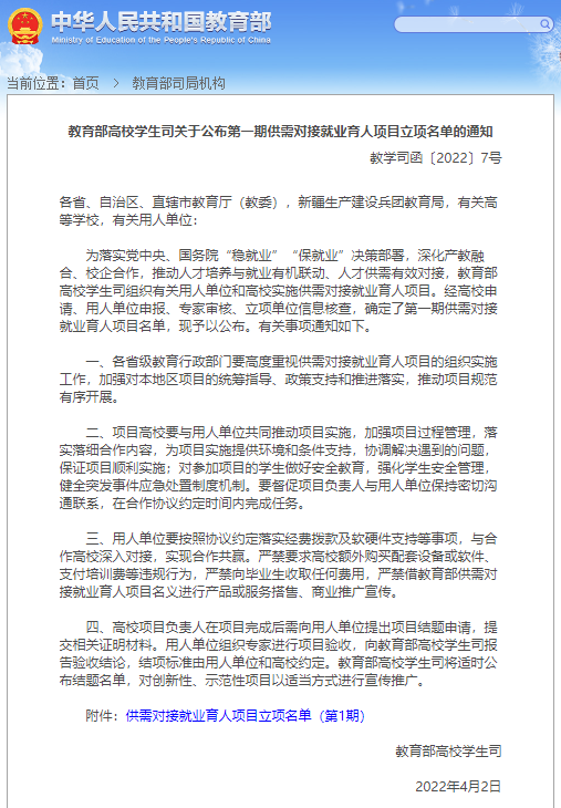 近日,教育部发布了《教育部高校学生司关于公布第一期供需对接就业育人项目立项名单的通知》(教学司函〔2022〕7号),我校经济管理学院、学生工作部学生就业服务中心申报的“365英国上市公司定向人才培养——就业育人一体化项目”等6个项目全部立项,其中定向人力资源提升项目2项、就业实习基地项目3项、人力资源提升项目1项。