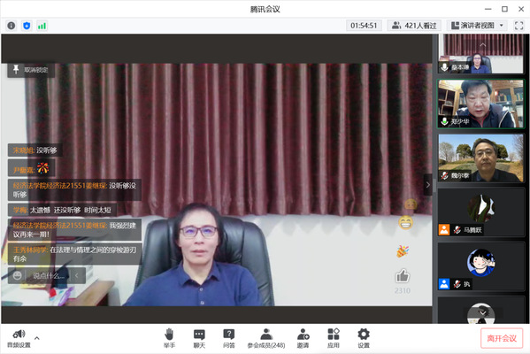 4月17日晚,科研处、法律学院主办的“名家讲坛”第105讲在线举办,中国海洋大学桑本谦教授受邀以“法律的联结”为主题开展学术讲座。本次讲座由我校副校长郑少华教授担任主持人,法律学院魏治勋教授担任与谈人,吸引了校内外师生近300人参与。