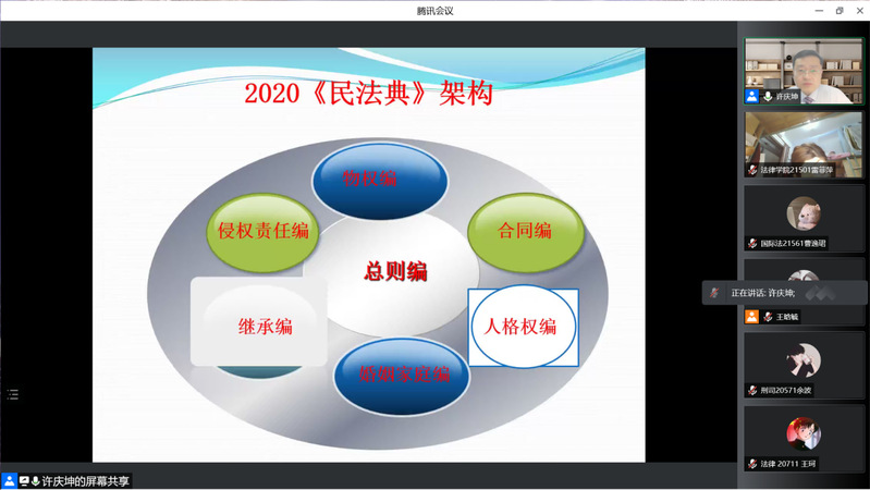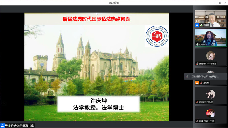 4月18日晚,由教务处、国际法学院主办的“名师讲坛”第5讲开讲。我校国际法学院教授,中国国际私法学会常务理事许庆坤在线为广大师生做“后民法典时代国际私法热点问题”主题报告。讲座由国际法学院副院长石俭平主持,校内外师生共400多人参加讲座。
