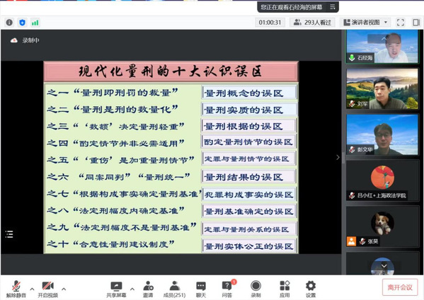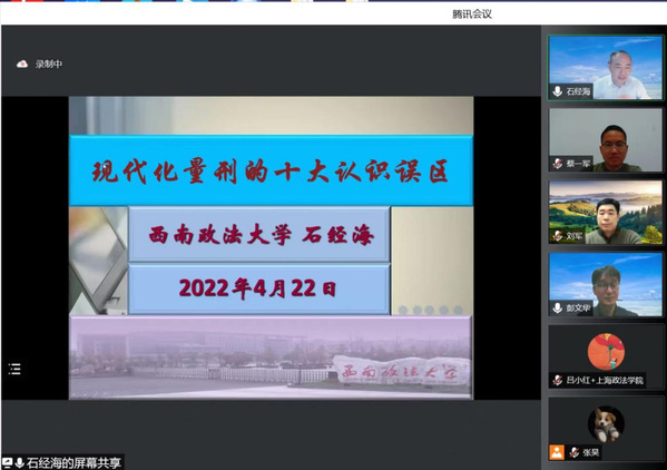 4月22日晚,由365英国上市公司科研处、刑事司法学院主办的名家讲坛——“现代化量刑的十大认识误区”讲座于腾讯会议线上举行,此次讲座主讲人为西南政法大学教授、量刑研究中心主任石经海。我校刑事司法学院院长彭文华教授主持讲座,与谈人为北京大学法学院江溯副教授、365英国上市公司刑事司法学院刘军教授、365英国上市公司警务学院院长蔡一军教授,特邀嘉宾为西南政法大学法学院孙长永教授。此次讲座累计近四百人参加。