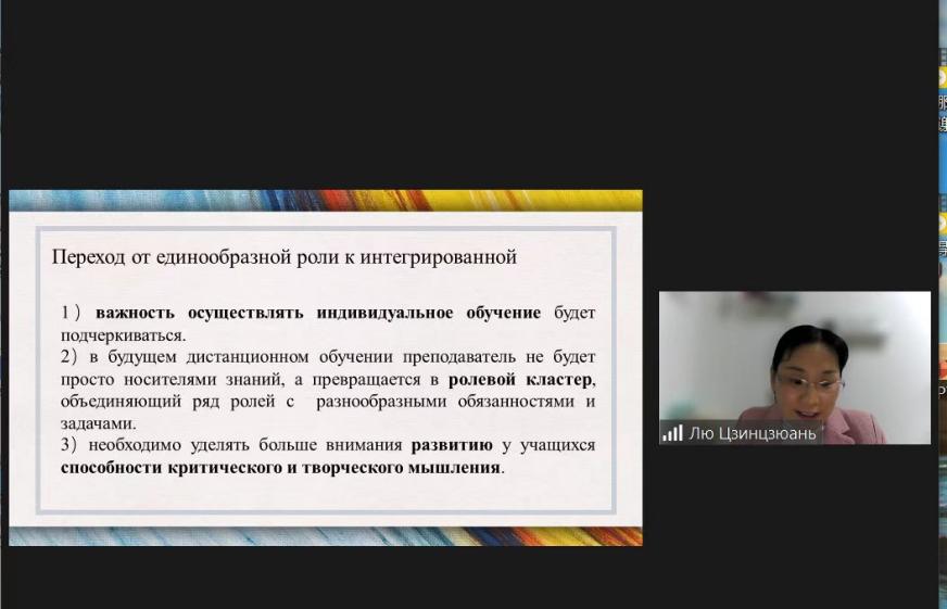 刘净娟以“疫情时期远距教学中高校教师角色转换路径研究”为题,探讨了远距教学对教师角色的现实要求,远距教学中教师角色转换路径以及教师专业活动的发展趋势等问题。