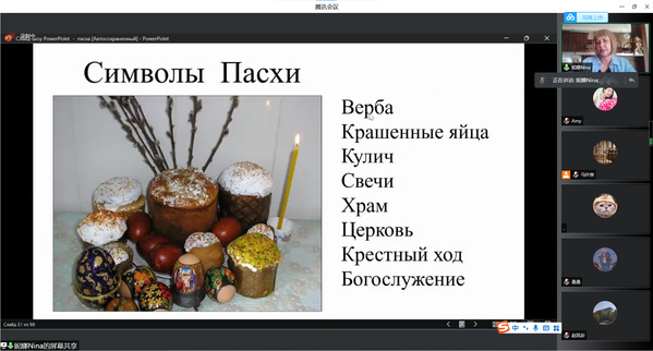 讲座过程中,妮娜副教授谈到,节日文化的内涵极为丰富,承载着一个民族的价值观、世界观、宗教信仰及独特的思维方式和民族心理。在俄罗斯民族文化中,复活节象征着春回大地、万物复苏、万象更新,也象征着心灵的净化,善良战胜邪恶。同西方复活节略不同的是,俄罗斯复活节的象征物有柳枝、彩蛋、专门为复活节烹制的“古利奇”蛋糕和奶渣糕等;在复活节当夜,教堂要举行盛大的祷告祈福仪式,仪式后还要举行庄重的圣十字架游行。在民间,一个传统的砸蛋游戏广为盛行。讲座中,妮娜副教授还介绍了俄罗斯联邦总统国民经济和行政学院汉语班的情况,转达了汉语班的俄罗斯大学生对中国朋友的良好祝愿。本次讲座受到了参与师生的一致好评,激发了我校学生继续深入探索俄罗斯丰富的民族文化、加强与俄罗斯大学生跨文化交流的兴趣。