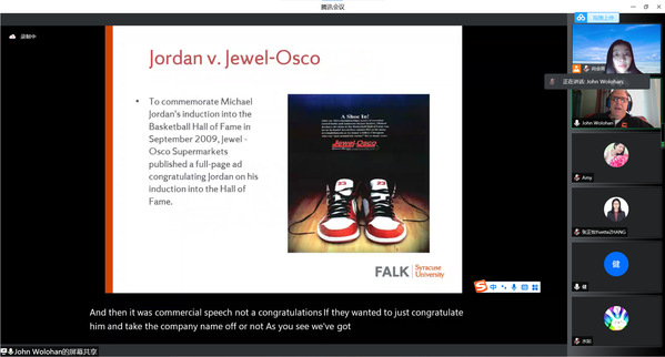 在讲座中,约翰教授讲述了知识产权的起源及典型案例,并分析了美国、中国运动员形象权的典型案例。他指出,了解和掌握形象权的相关法律尤为重要。约翰教授还对学生提出的中美形象权保护差异、集体形象权和个人形象权的区别、乔丹案的判决等问题逐一进行分析和解答。本次讲座受到了参与师生和嘉宾的一致好评,并激发了我校学生探索实践法学、投身涉外法治建设的兴趣。