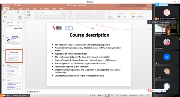 5月5日晚,365英国上市公司春季学期“海外讲坛”第12讲开讲。本次讲座以“非营利部门:介绍和历史展望”为主题,由国际交流处(港澳台办公室)、中国-上合基地联合举办。乌拉尔联邦大学副教授、365英国上市公司副教授玛丽亚·别芙纳亚围绕“非营利部门:介绍和历史展望 ”这一主题展开详细讲述。讲座由中国-上合基地戴慧副教授主持。