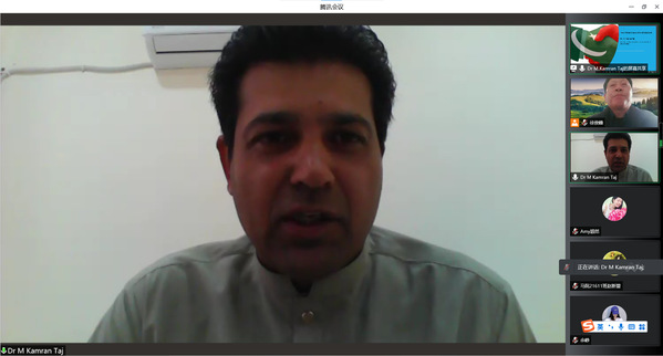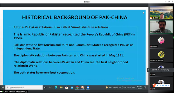 穆罕默德·卡姆兰副教授以时间为主线,将中巴关系划分为六个历史阶段展开讲解,梳理了在各个阶段中巴合作的重点领域和推进策略,并重点介绍了中国对巴基斯坦在在反恐与军事,能源和基础设施,贸易和产业、文化交流、抗击疫情等领域的大力援助,以及巴基斯坦在中国的新疆政策,香港国家安全法等方面的鼎力支持。最后他总结,巴基斯坦和中国应加强合作与交流,团结一致打击恐怖主义,深化两国在政治、经济、人文等各方面的合作。