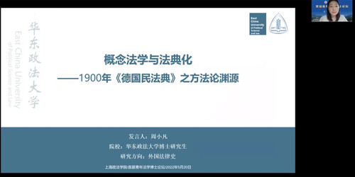 论坛第一单元为“法理学热点问题研讨”,由我校法律学院魏治勋教授主持,5位博士进行了主题发言,3位博士参与与谈。华东政法大学周小凡博士以“概念法学与法典化”为主题,介绍了概念法学的产生、时代任务,以及对法典化法律观产生的影响;山东大学汪潇博士以民法典立法实践为例,向大家讲述了当代中国立法实践的现代性向度,以及其“渐进式建构”的立法模式;上海交通大学、新南威尔士大学吴尚轩博士从历史的视角、对比的纬度,论述了公司法中治理优化相关概念的中国话语构造问题;西北政法大学刘超博士以习近平法治思想引领建设社会主义法治新疆为题,进行了富有创新意识的分享。他提出,依法治疆是巩固党在新疆执政根基的重要途径;浙江大学谭婷博士从法律类推的体系化分享入手,论证了法律类推的法理运用是构建“回应型审判”的应有之义。在与谈环节,华东政法大学吴冬兴博士、南京师范大学王琦博士,以及上海交通大学鲍坤博士从各自的学术背景和问题意识进行了精彩评述。