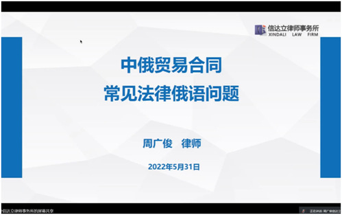 周律师剖析了中俄贸易合同中双方买卖条款及仲裁条款,分析了该如何规避交易中的种种风险。结合当下的国际局势提出了一些需要特别注意的法律问题,介绍了新冠疫情中不可抗力的界定,对俄制裁带来的贸易纠纷,提出了自己的解决方案。周律师还讲解了法律翻译的常见错误,并推荐了研究法律俄语的工具书。