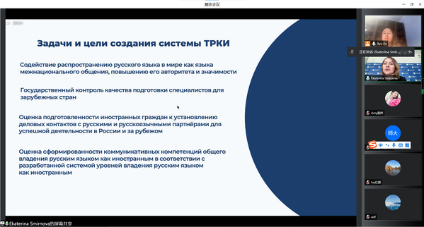 斯米尔诺娃副教授在讲座中指出,俄罗斯对外俄语国家测试体系于1992年开始推行,包含“词汇、语法、阅读、写作、听力、口语”五个子科目,分为6个水平等级,考试内容由莫斯科大学、彼得堡大学、友谊大学和普希金俄语学院的专家制定,其目的是推广俄语传播、监督海外俄语人才培养质量。每个等级的水平考试都有一定的学时和词汇量要求,以及交际任务的侧重点,外国留学生如需要在俄罗斯高校进行学历教育,需要达到第三等级(B1级)的水平。