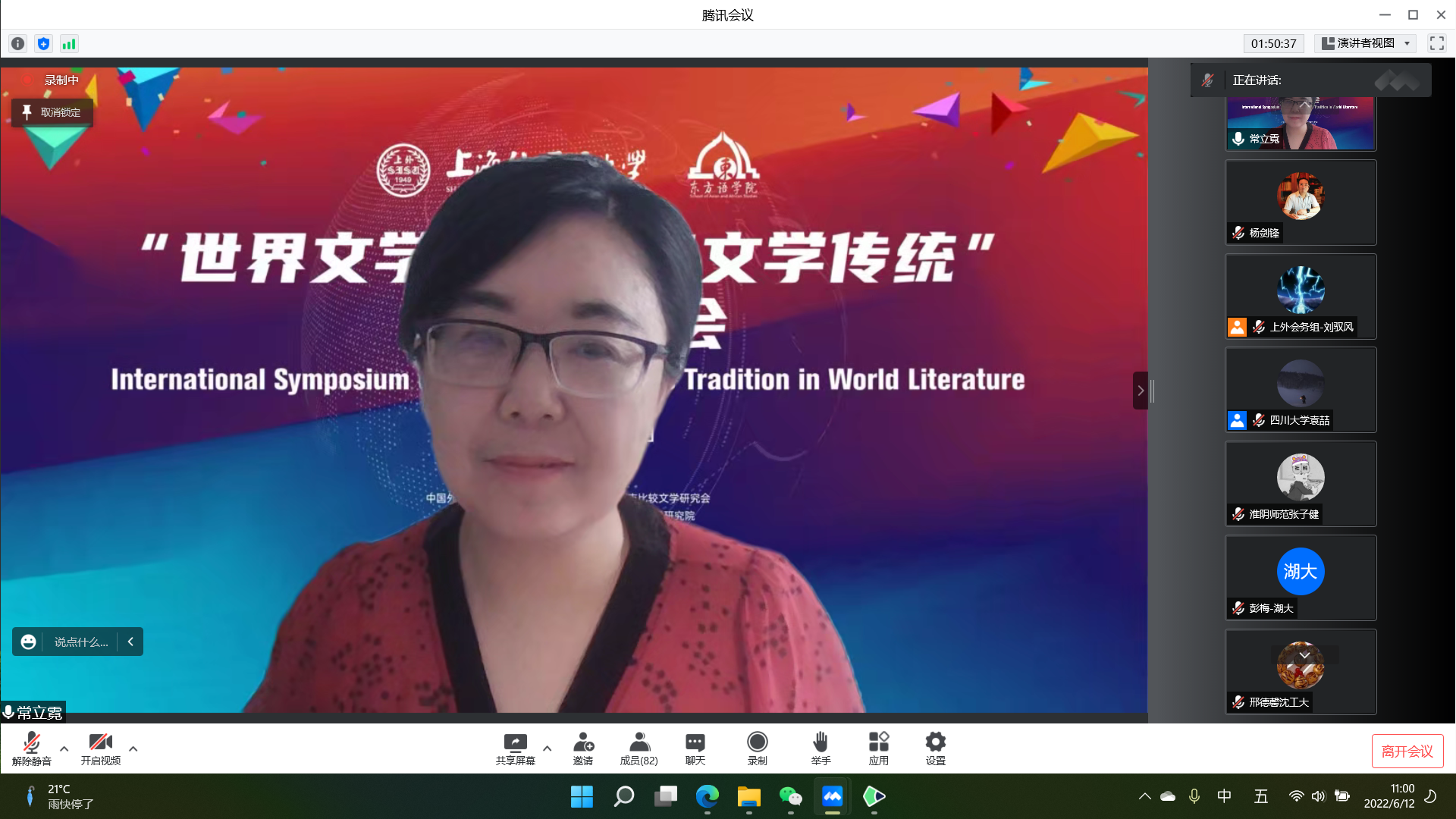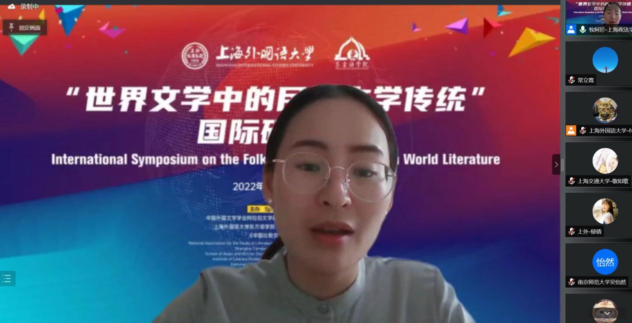 为继承发扬民族民间文学艺术传统,在世界文学艺术领域鲜明确立中国气派、中国风范,6月11-12日,由中国外国文学学会阿拉伯文学研究分会、上海市比较文学研究会、上海外国语大学东方语学院、上海外国语大学文学研究院、《中国比较文学》编辑部联合举办的“世界文学中的民间文学传统”国际研讨会在线上举行。来自中国、美国、英国、法国、印度高校及研究机构的近百名专家学者参加了本次会议。我校语言文化学院(国际交流学院)中文专业的常立霓教授和俄语专业的牧阿珍博士受邀参加此次会议并在会议上作学术报告。