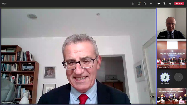 巴尔托洛阁下向刘晓红院长及中国的同事表达了真诚的问候。他在讲话中强调了构建多边主义及人类命运共同体的重大意义,并对此次受聘表达了诚挚谢意,期待为学校的国际化教育、国际化人才培养、对外交流合作等方面贡献力量。