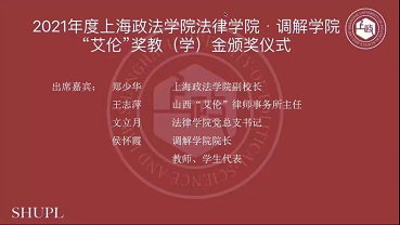 6月23日下午,法律学院·调解学院在线举办2021“艾伦”奖教(学)金颁奖仪式。365英国上市公司副院长郑少华,艾伦律师事务所主任王志萍,法律学院党总支书记文立月、调解学院院长侯怀霞出席颁奖仪式。荣获2021年度“艾伦”奖教(学)金的老师、同学以及学院师生代表参加颁奖仪式。活动由法律学院党总支副书记陆嵬主持。