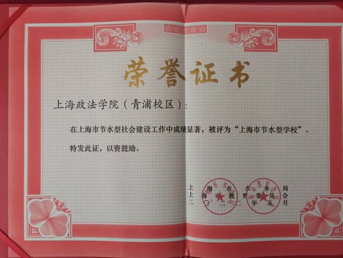 2021年11月,由上海市水务局、上海市教委、上海市供水管理事务中心(市节约用水促进中心)、松江区水务局组成的节水型高校创建工作专家考核组对我校创建节水型学校工作进行现场检查评审,对我校在节水型学校创建工作中做出的努力给予了充分的肯定。专家组认为我校节水制度完善、教育宣传到位,计量表具符合要求,第三方评估数据支撑充分,具体措施落实到位,工作措施具有创新性,创建效果比较明显,通过了我校水平衡测试和创建“节水型学校”现场评审工作,并当场颁发了水平衡测试合格备案证书。2022年5月,市水务局、市教委对2021年申报的“上海市节水型学校”的单位进行了综合评审,我校喜获殊荣。