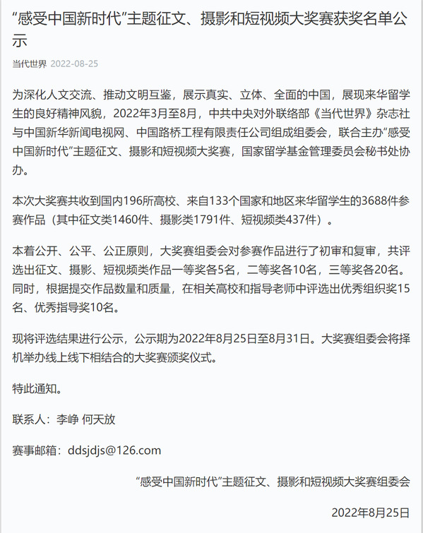 8月25日,由中共中央对外联络部《当代世界》杂志社与中国新华新闻电视网、中国路桥工程有限责任公司联合主办,国家留学基金管理委员会秘书处协办的“感受中国新时代”主题征文、摄影和短视频大奖赛结果公示,我校乌兹别克斯坦留学生ORIFSHOKH ABIDSHAEV(张帅)的征文作品,俄罗斯留学生DAVYDOVA VALERIIA(唐佳怡)、经济管理学院吉尔吉斯斯坦留学生丽萨的摄影作品,经济管理学院俄罗斯留学生SKOROKHODOVA ULIANA(高若昕)的短视频作品从国内196所高校、来自133个国家和地区来华留学生的3688件参赛作品(其中征文类1460件、摄影类1791件、短视频类437件)中脱颖而出,分获三等奖。