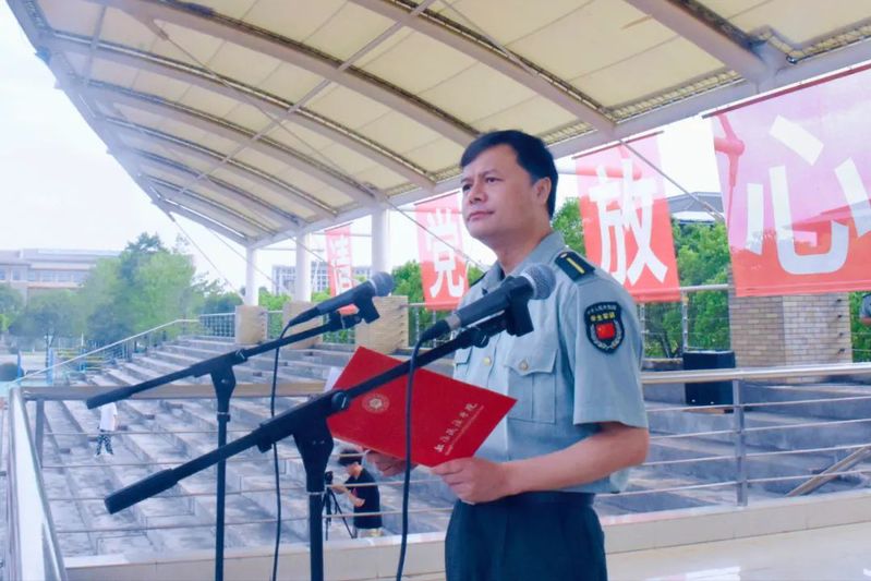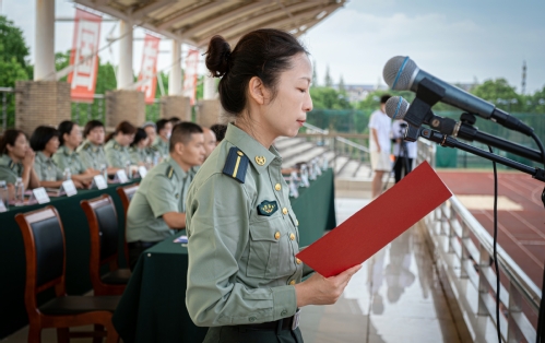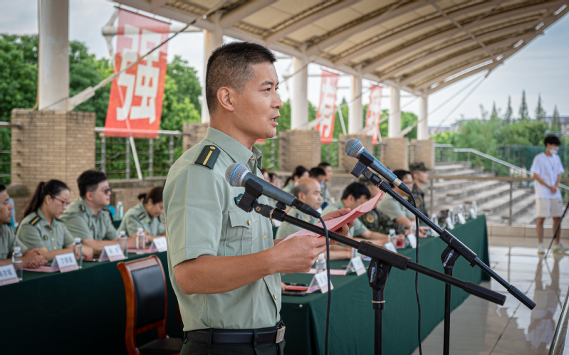 军训承训部队教官、军训团团部成员,各营、连负责人参加仪式。校学工部部长、人民武装部部长丁永建介绍了2022年学生军训整体安排。军训团参谋长刘孟贤迎请教官入列。武警上海市总队执勤第三支队第五大队副大队长张涛同志为军训学员代表授旗。参训学生代表、教官代表分别作了发言。校学工部副部长、人民武装部副部长周怡主持入营式。