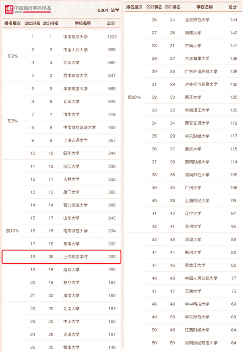 9月21日,高等教育评价专业机构软科正式发布“2022软科中国最好学科排名”,我校法学学科总分为205分,位列全国第18位(前9%),进入软科中国一流学科(前10%)行列。与2021年第35名相比,我校法学学科排名上升17名。上海高校中共有4所进入前10%,我校位列第3。