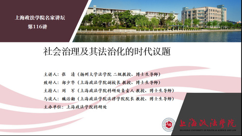 讲座伊始,张清教授阐述了由”社会管理“到”社会治理“是蕴含着理念、方法、手段和制度等多个层面的深刻变革。张清教授随后从空间正义、国家与社会、生活政治学等四个角度介绍了社区治理的十大关键词及分析工具。最后,张清教授讲述了市域社会治理法治化的治理理念与体系,并作出了简要总结。