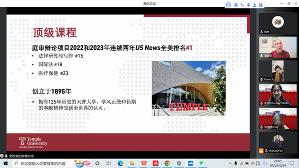 10月24日晚,我校2022年国际伙伴周秋季“海外讲坛”在线讲座第十一讲顺利举办。本次讲座以“天普大学交流学习生活分享”为主题,由来自美国天普大学法学院副院长桑国亚主讲,国际交流处国际会议及因公出访专员范瑞娟主持,天普大学中国法制项目运营主任杨晨(Karen.Y)、我校国际交流处副处长张正怡、学生项目主管刘灵出席,数百位同学报名参与。
