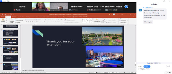 讲座过程中,阿卜杜拉·昆苏鲁女士以卡拉干达布克托夫大学学习生活为主,借助图片展现了卡拉干达布克托夫大学优美的校园环境,完善的校园设施以及丰富的校园生活;详细介绍了该校的优势专业以及该校与我校的交流合作项目。阿卜杜拉·昆苏鲁女士与我校参会同学热情互动,详细耐心地回答我校同学有关两校间学术交流和实习项目开设的问题。此次活动有助于两校之间学术和实习交流项目的持续推进,加强两校合作,为我校学生提供更充足的海外留学工作资源。