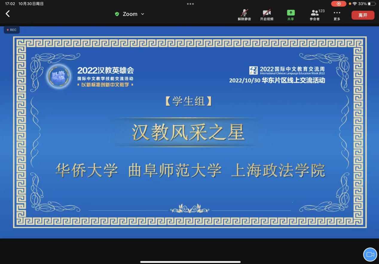 10月30日,2022“汉教英雄会”华东片区国际中文教学技能交流活动圆满落幕。语言文化学院(国际交流学院)汉语国际教育专业学生团队在华东片区49所高校的62支队伍中脱颖而出,成功入围华东片区国际中文教学技能线上交流名单,并最终获得“汉教风采之星”称号。此次活动是我校汉语国际教育专业学生第一次组队参加,由汉语国际教育教研室主任翁晓玲副教授担任指导教师,董一禾、王艺垠、宋雨馨、黄思婷、李添娇五位汉语国际教育专业本科生组成。
