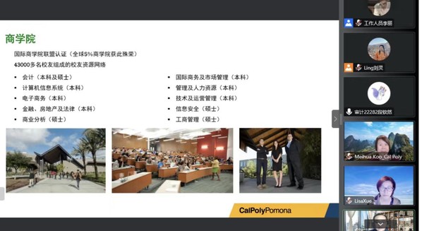 11月4日下午,我校2022年国际伙伴周秋季“海外讲坛”在线讲座第二十三讲顺利举办。本次讲座以“西岸海风:加州理工大学波莫纳分校学习生活”为主题,主讲人为美国加州州立理工大学波莫纳分校(以下简称“波莫纳”)全球教育交流学院项目主管王英川老师。波莫纳商学院研究生项目主任古美华教授、商学院金融、房地产与法律系主任郁薇教授、全球教育交流学院主任薛亚萍教授、商学院金融、房地产与法律系助理教授商舒博士,我校国际交流处副处长张正怡、出入境管理科科长李霄晨出席。讲座由国际交流处学生项目专员刘灵主持,我校近百名同学在线聆听。