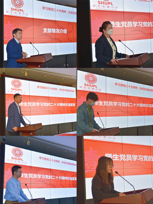 师生党建沙龙活动中,来自党办校办党支部朱慧博、郭小杰,上政第17学生党支部丁子洋、第18学生党支部严正宇、第39学生党支部曾淋分别围绕二十大精神学习作了交流发言。
