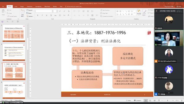 讲座中,方泉教授详细讲解了《澳门刑法典》的近代史、澳门刑法的本地化进程、现代化多元立法模式的确立及澳门刑法存在的刑法规范内容不一致、罪名竞合关系不明确等问题,并评析了澳门刑法所存在的问题的社会背景、原因。列举了澳门刑法在近现代不断与实践相结合更加本地化和与时代相接轨愈发现代化的具体事例。最后,方泉教授提出继续推进澳门刑法本地化和现代化的方向和路径。