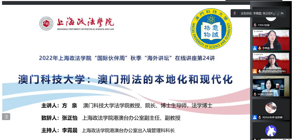 11月10日下午,我校2022年国际伙伴周秋季“海外讲坛”在线讲座第二十八讲顺利举办。本次讲座以“澳门刑法的本地化和现代化”为主题,由澳门科技大学法学院教授方泉主讲。讲座由我校港澳台办公室出入境管理科科长李霄晨主持。港澳台办公室副主任张正怡出席会议,我校百余位师生在线聆听。